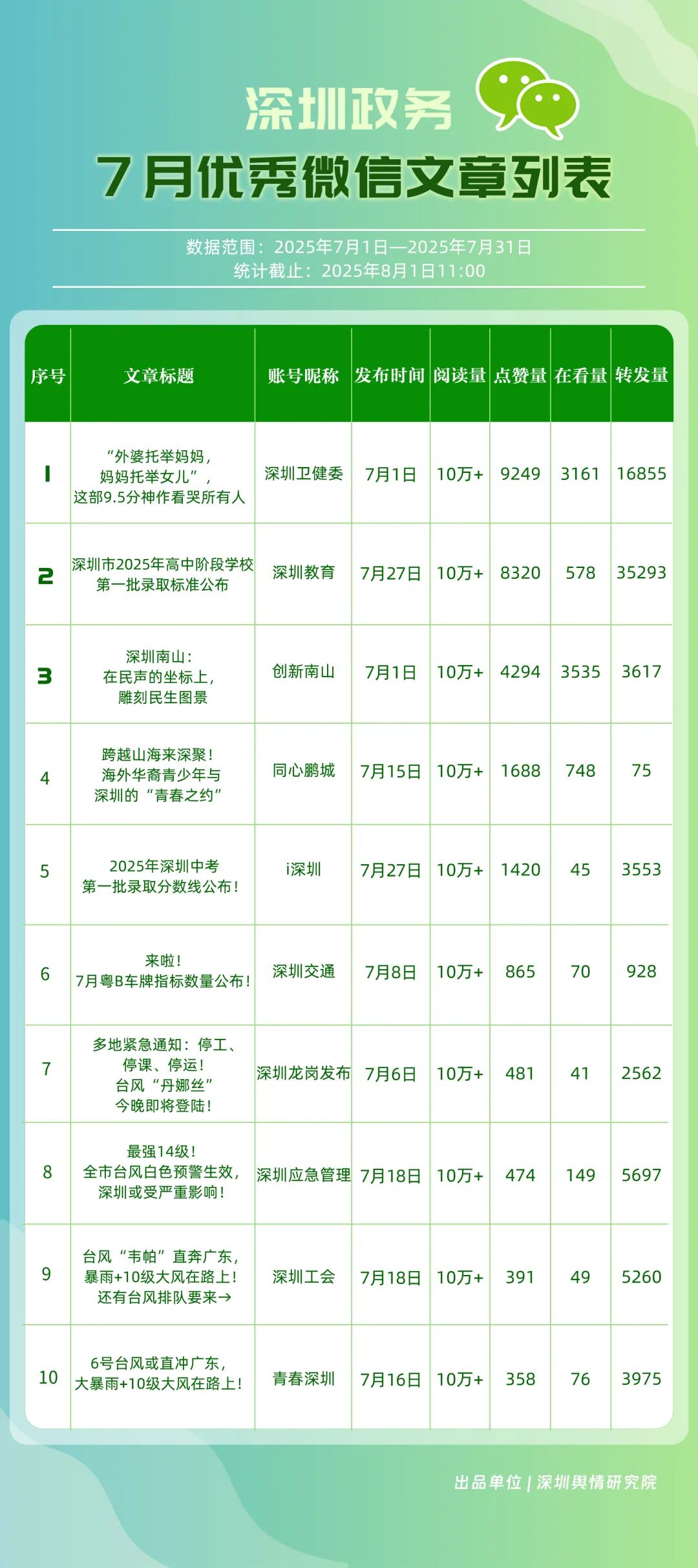 7月,30個政務微信公眾號入選“深圳優(yōu)秀政務微信公眾號”榜單,其中包括“深圳衛(wèi)健委”“深圳龍崗發(fā)布”“幸福福田”“創(chuàng)新南山”“i深圳”“深圳教育”“青春深圳”“深圳工會”“深圳光明”“濱海寶安”等。7月,“深圳衛(wèi)健委”內(nèi)容專業(yè)性與傳播力優(yōu)勢穩(wěn)固,整體表現(xiàn)保持較高水平,位于榜首;“深圳龍崗發(fā)布”聚焦民生服務與區(qū)域活動宣傳,實現(xiàn)傳播效果提升,位居第二;“幸福福田”表現(xiàn)同樣不俗,排名第三?!皠?chuàng)新南山”“深圳教育”“深圳工會”等也積極發(fā)布高質(zhì)量信息與服務內(nèi)容,能夠較好平衡內(nèi)容“質(zhì)”與“量”,排名有所提升。上榜微信公眾號依托特色優(yōu)勢深耕內(nèi)容創(chuàng)作,將優(yōu)質(zhì)內(nèi)容作為核心支撐,成為政務傳播領域的優(yōu)秀典范。