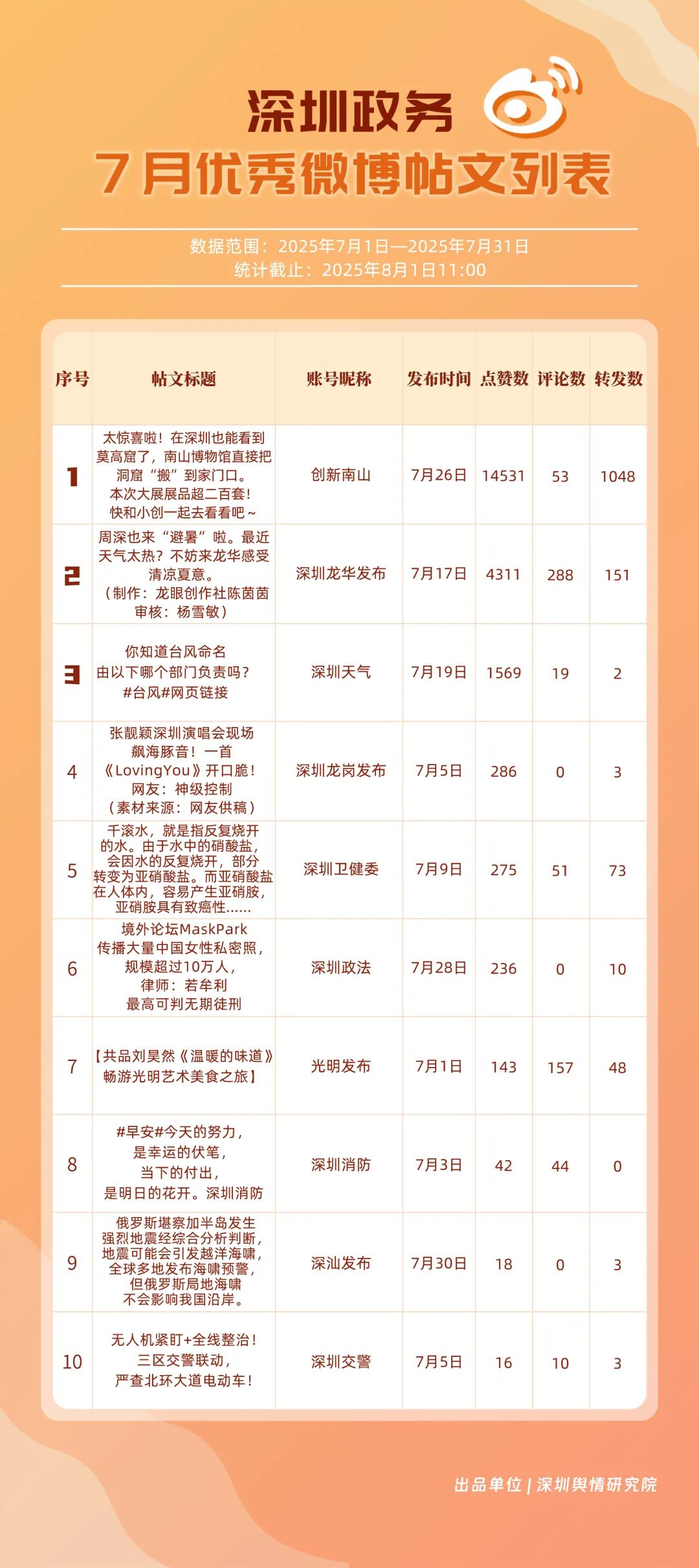 7月,“深圳天氣”“創(chuàng)新南山”“深圳衛(wèi)健委”“深圳消防”“深圳公安”“深圳龍華發(fā)布”“深汕發(fā)布”“深圳交警”“福田發(fā)布”“深圳龍崗發(fā)布”等20個賬號入選“優(yōu)秀政務微博號”。其中,“深圳天氣”以活躍、互動、傳播指數(shù)三項滿分,蟬聯(lián)榜首;“創(chuàng)新南山”以總分96.63躍居第二,排名呈上升趨勢;“深圳衛(wèi)健委”位列第三,評分也在90分以上,其科普信息持續(xù)獲得市民廣泛認可。以上優(yōu)秀的政務微博賬號精準貼合平臺的傳播規(guī)律,用獨特的賬號風格展現(xiàn)各自特色與魅力。