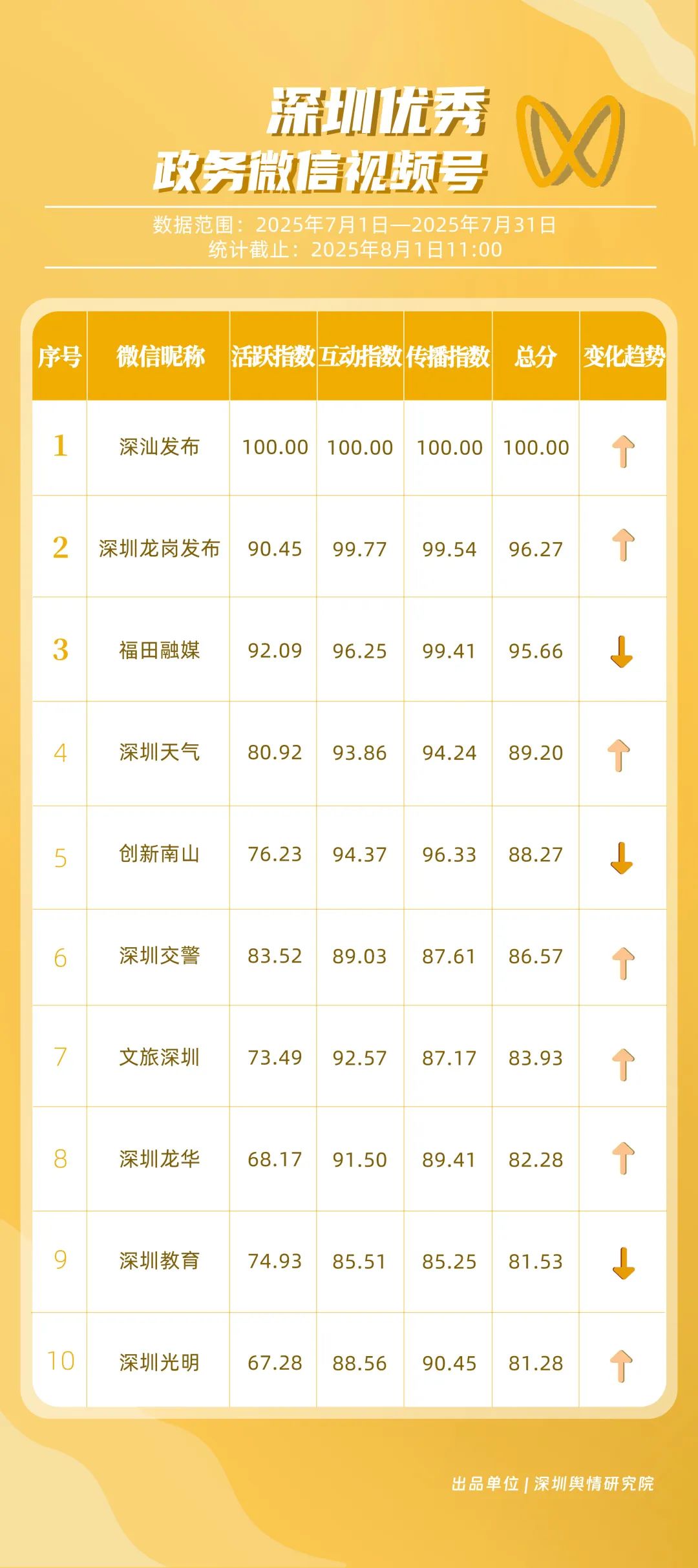 7月,獲得“深圳優(yōu)秀政務微信視頻號”稱號的是“深汕發(fā)布”“深圳龍崗發(fā)布”“福田融媒”“深圳天氣”“創(chuàng)新南山”“深圳交警”“文旅深圳”“深圳龍華”“深圳教育”“深圳光明”。其中,“深汕發(fā)布”持續(xù)輸出熱點內(nèi)容,收獲大量網(wǎng)民關注、互動,三項指標均達滿分,位居榜首;“深圳龍崗發(fā)布”“福田融媒”緊隨其后,總分均超過95分,兩賬號通過多樣化的內(nèi)容呈現(xiàn),在活躍、互動及傳播等方面均有出色表現(xiàn);“深圳天氣”“創(chuàng)新南山”“深圳交警”等賬號也獲得不錯成績,總分均在85分以上。上榜微信視頻號精準把握平臺特性,高效傳遞了政務信息,更成為展現(xiàn)城市活力、拉近政府與民眾距離的重要窗口。