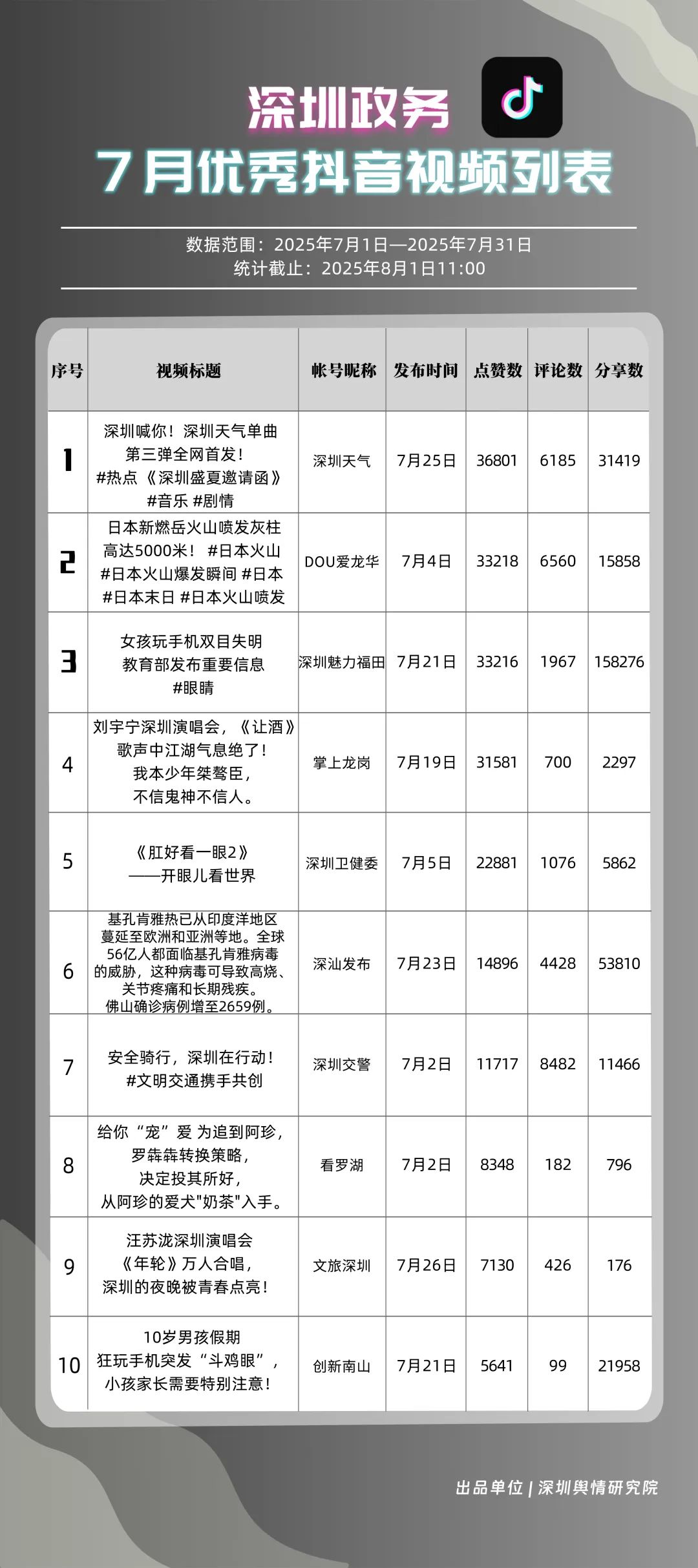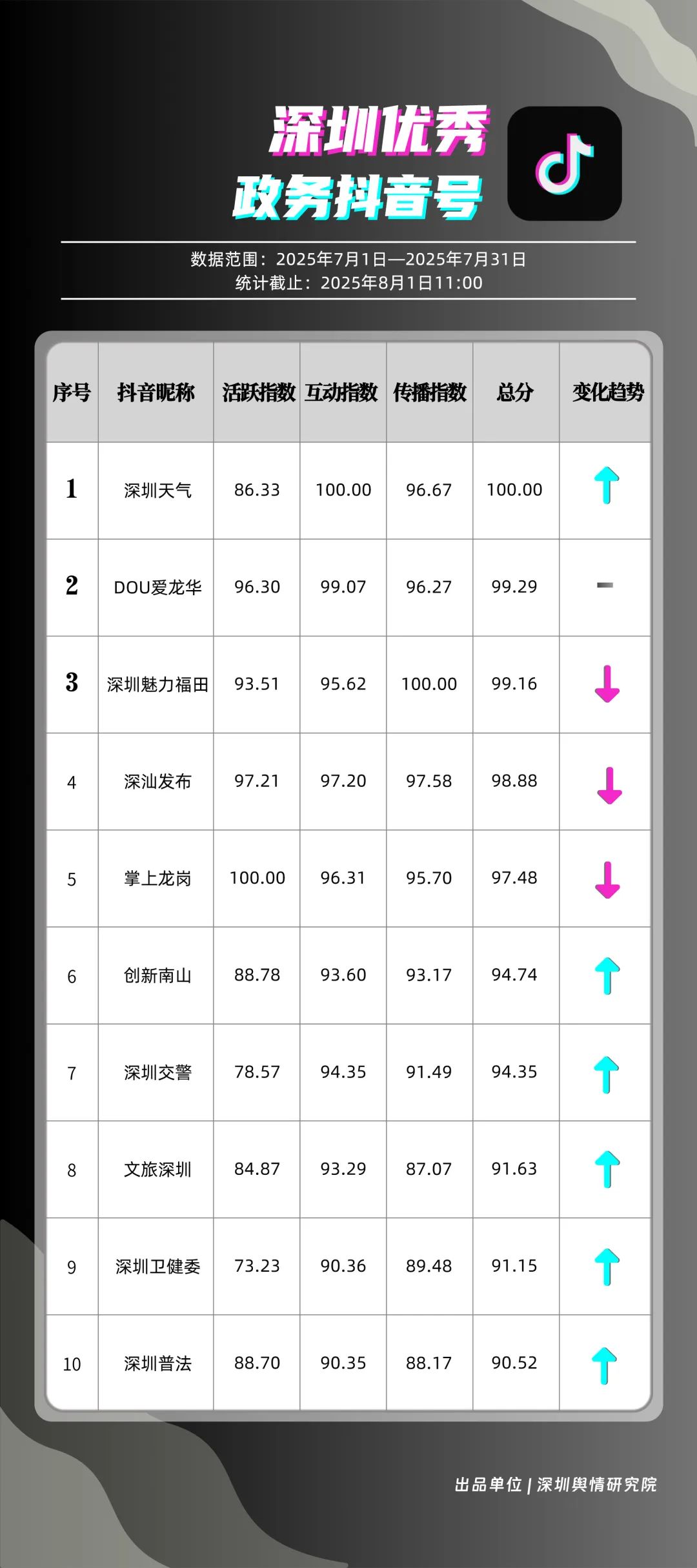 7月,“深圳天氣”“DOU愛龍華”“深圳魅力福田”“深汕發(fā)布”“掌上龍崗”“創(chuàng)新南山”“深圳交警”“文旅深圳”“深圳衛(wèi)健委”“深圳普法”共10個政務抖音號獲得“優(yōu)秀政務抖音號”稱號。其中,“深圳天氣”互動指標獲滿分,憑借氣象與趣味相結合的創(chuàng)新科普形式,領跑優(yōu)秀政務抖音號;“DOU愛龍華”“深圳魅力福田”分別位列第二、三名,通過聚焦網(wǎng)絡熱點、挖掘創(chuàng)意內(nèi)容,不斷提升傳播效能,展現(xiàn)出強大的政務新媒體影響力;“深汕發(fā)布”“掌上龍崗”“創(chuàng)新南山”等賬號緊隨其后,上榜的優(yōu)質(zhì)政務抖音號用短視頻語言強化傳播效果,展現(xiàn)了鮮明的賬號特色和風采。