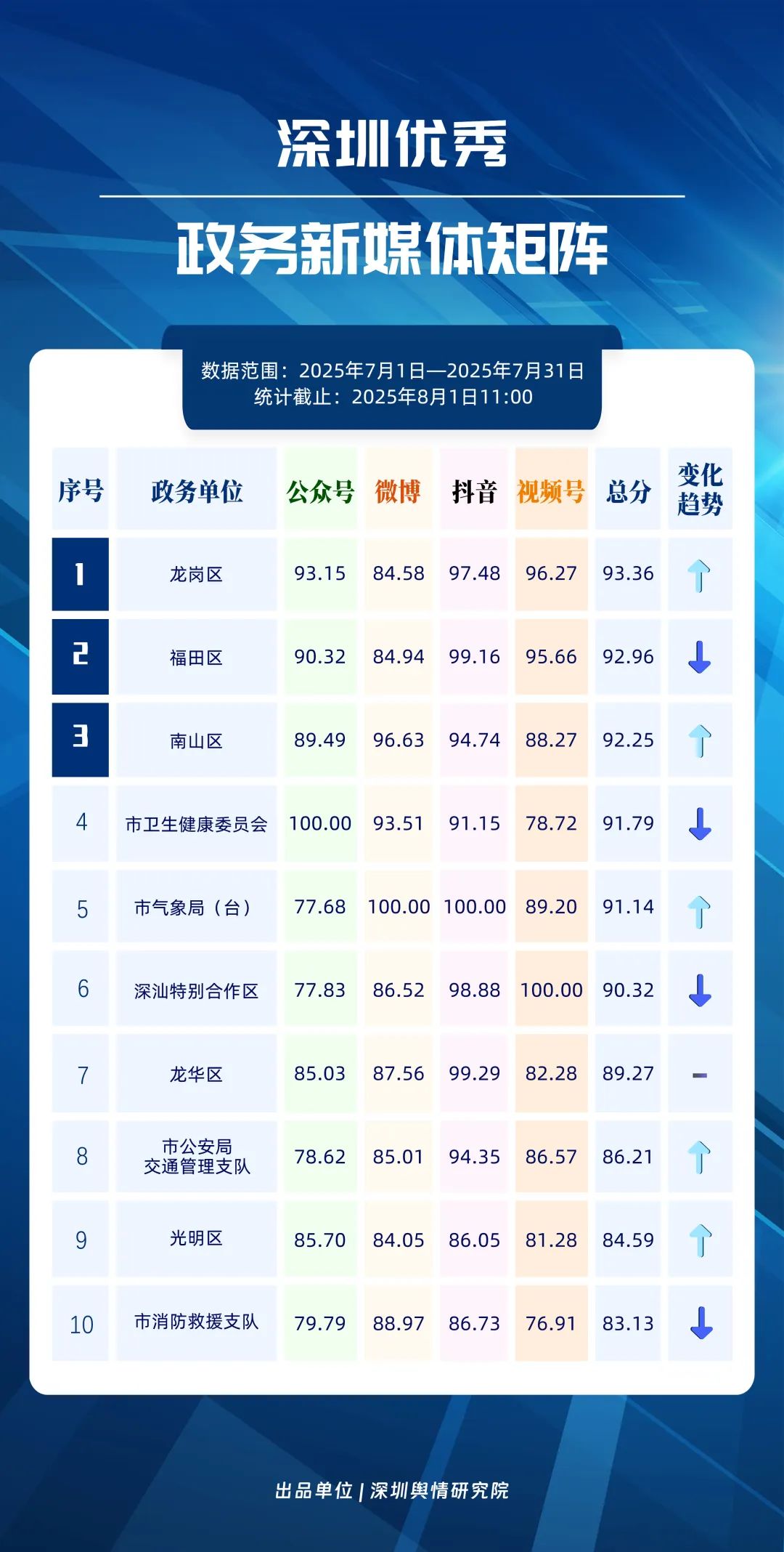 7月,深圳政務新媒體矩陣各展所長,為市民帶來豐富實用的信息服務。龍崗區(qū)、福田區(qū)、南山區(qū)、市衛(wèi)生健康委員會、市氣象局(臺)、深汕特別合作區(qū)、龍華區(qū)、市公安局交通管理支隊、光明區(qū)、市消防救援支隊的新媒體矩陣入選“深圳優(yōu)秀政務新媒體矩陣”榜單。值得關注的是,龍崗區(qū)新媒體矩陣在7月著力提升內(nèi)容質(zhì)量,于抖音和微信視頻號平臺得分顯著提高,成功登頂;福田區(qū)新媒體矩陣在抖音平臺表現(xiàn)突出,位列榜單第二;南山區(qū)新媒體矩陣則在微博和抖音平臺保持評分優(yōu)勢。此外,市氣象局(臺)、市公安局交通管理支隊和光明區(qū)的排名也實現(xiàn)明顯上升,體現(xiàn)出政務新媒體矩陣整體競爭力持續(xù)增強。