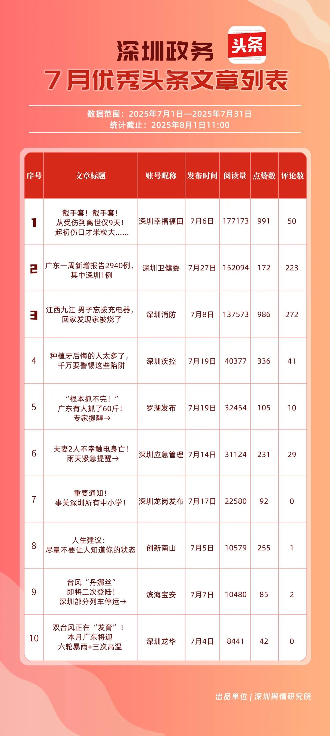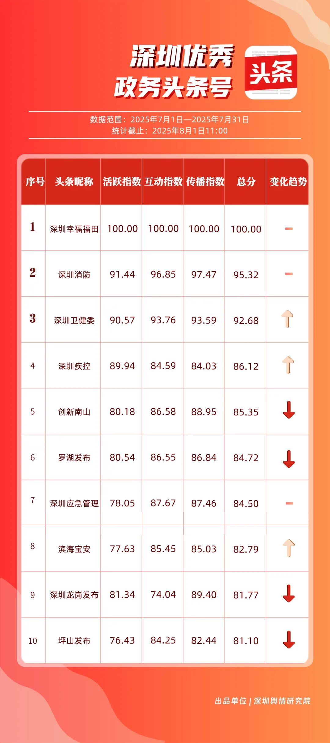 7月,“深圳幸福福田”“深圳消防”“深圳衛(wèi)健委”“深圳疾控”“創(chuàng)新南山”“羅湖發(fā)布”“深圳應急管理”“濱海寶安”“深圳龍崗發(fā)布”“坪山發(fā)布”共10個政務頭條號入選“優(yōu)秀政務頭條號”榜單。“深圳幸福福田”“深圳消防”憑借優(yōu)質(zhì)內(nèi)容持續(xù)吸引用戶關注,穩(wěn)居前二;“深圳衛(wèi)健委”表現(xiàn)亮眼,評分達92.68分,排名較6月有所上升;“深圳疾控”同樣進步明顯,在疾病預防控制信息傳播上發(fā)揮了重要作用?!皠?chuàng)新南山”“羅湖發(fā)布”“深圳應急管理”等上榜賬號,也各展所長,始終將優(yōu)質(zhì)內(nèi)容作為核心抓手,成為政務新媒體領域內(nèi)容創(chuàng)作與傳播的典范。