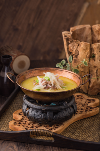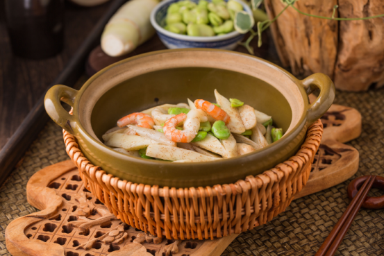 食材多來自水澤,藕帶、菱角、茭白、蠶豆瓣、大蝦仁,自制蝦醬爆炒起香,時(shí)蔬的白綠點(diǎn)綴蝦仁的淡粉,如青荷托芙蓉之色,砂鍋盛上,滋滋作響,讓人眼前浮現(xiàn)出“蛙聲喧夏夜,魚影動(dòng)荷塘”的畫面。