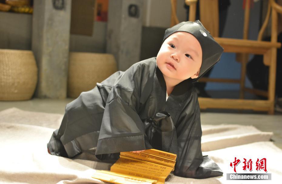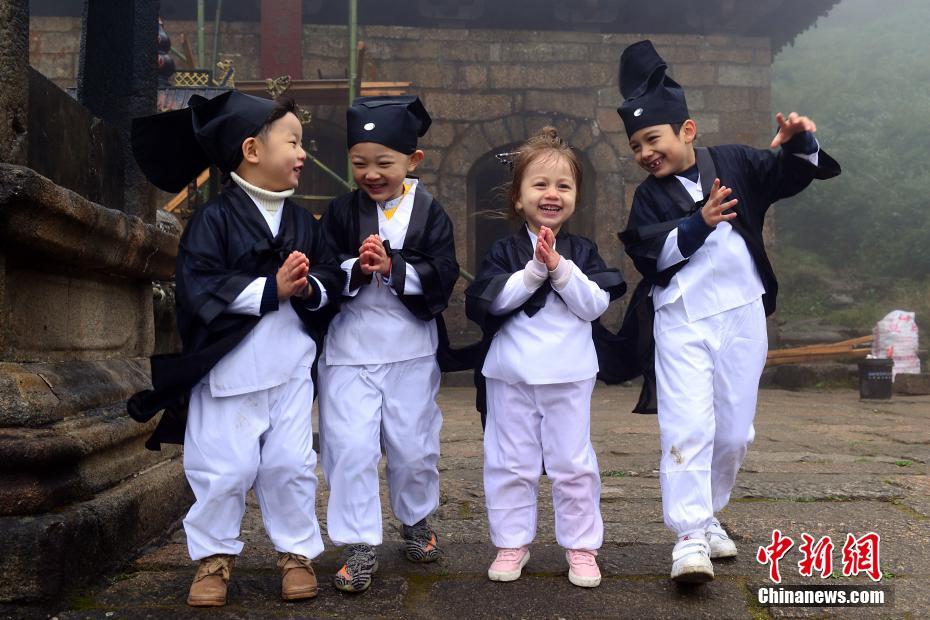 10月16日,在“道教名山”、世界自然遺產(chǎn)地江西上饒三清山,5名來自中外的萌娃身穿統(tǒng)一道服,手持竹簡,在三清宮跟著道教師傅朗讀《道德經(jīng)》、《弟子規(guī)》,學(xué)習(xí)太極拳、書法、古箏等中國傳統(tǒng)文化。這群萌娃中年齡最小的僅11個月,年齡最大也只有6歲。程希雪攝