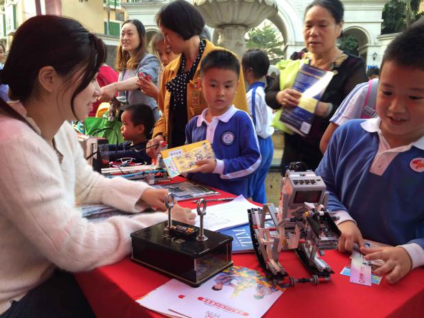 市民們?cè)隗w驗(yàn)EV3編程機(jī)器人與電磁感應(yīng)千人震項(xiàng)目
