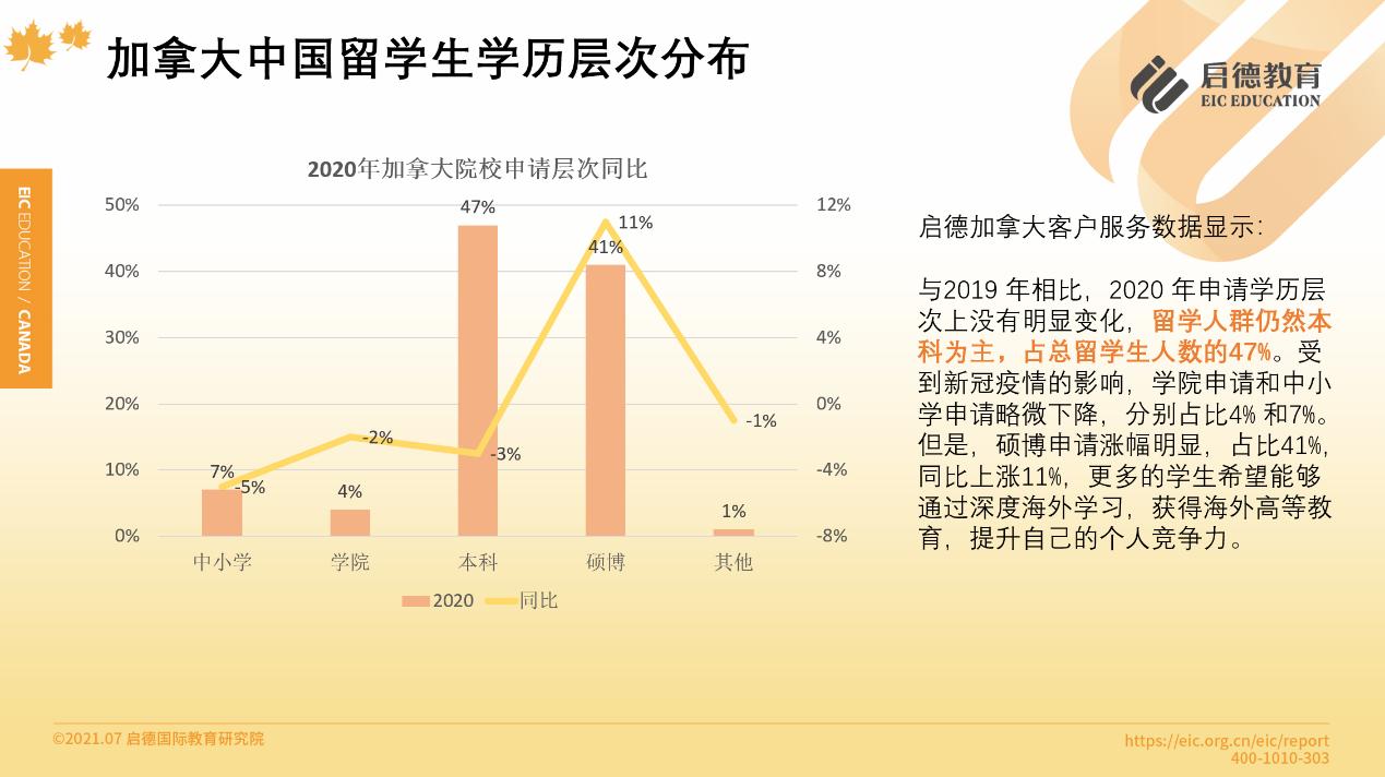 另一組數(shù)據(jù)顯示,2020年中國內(nèi)地學(xué)生新增人數(shù)最多的三個(gè)省為安大略?。?9.78% )、英屬哥倫比亞?。?6.17% )、魁北克?。?.49% )。一方面,安大略省與英屬哥倫比亞省這兩個(gè)省份的教育資源非常豐富,有多所世界知名大學(xué)讓中國學(xué)生選擇;另一方面,多倫多、溫哥華、渥太華等大城市均在這兩個(gè)省份,工作機(jī)會(huì)多,移民政策也相對(duì)成熟,對(duì)希望留在加拿大發(fā)展的留學(xué)生很具吸引力。