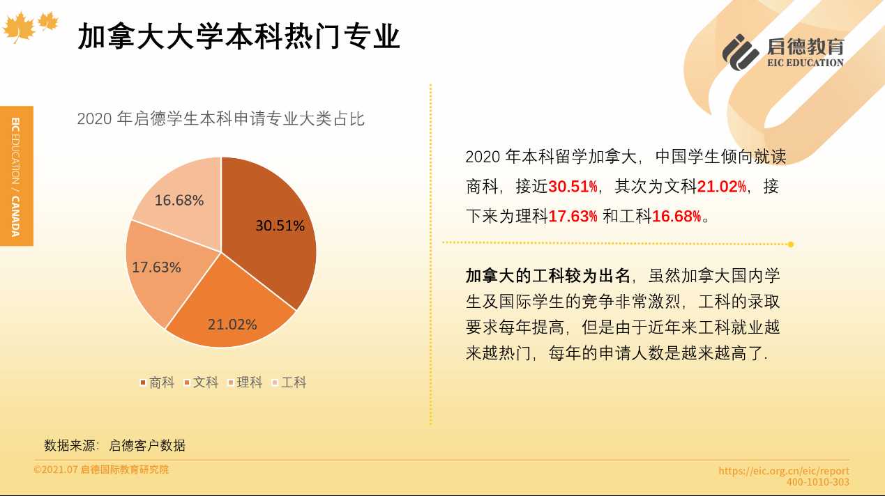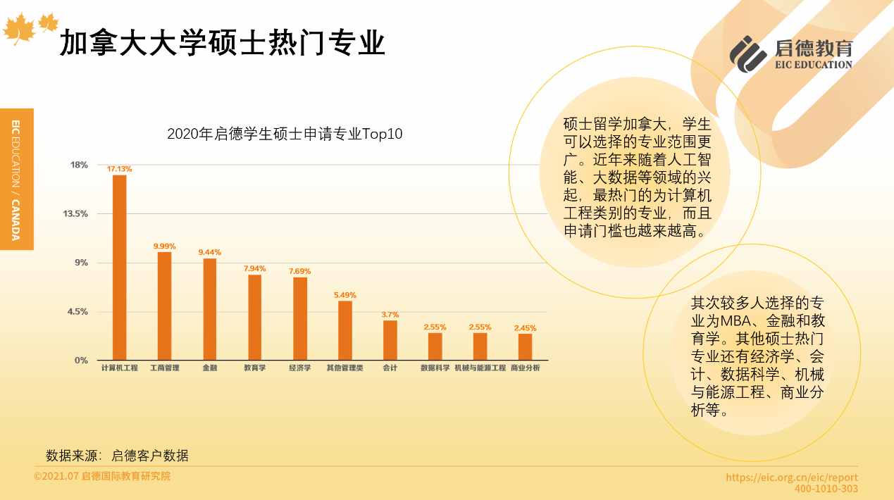 啟德留學(xué)客戶服務(wù)數(shù)據(jù)顯示,2020年加拿大本科階段,理工科專業(yè)占比34.31%,商科占比30.51%,文科21.02%,理工科的申請(qǐng)人數(shù)超過了商科。碩士階段選擇最多的專業(yè)是計(jì)算機(jī)工程(17.13% )、 MBA (9.99% )、金融(9.44% )與教育學(xué)(7.94% ),其他碩士熱門專業(yè)還有經(jīng)濟(jì)學(xué)、會(huì)計(jì)、數(shù)據(jù)科學(xué)、機(jī)械與能源工程、商業(yè)分析等。
