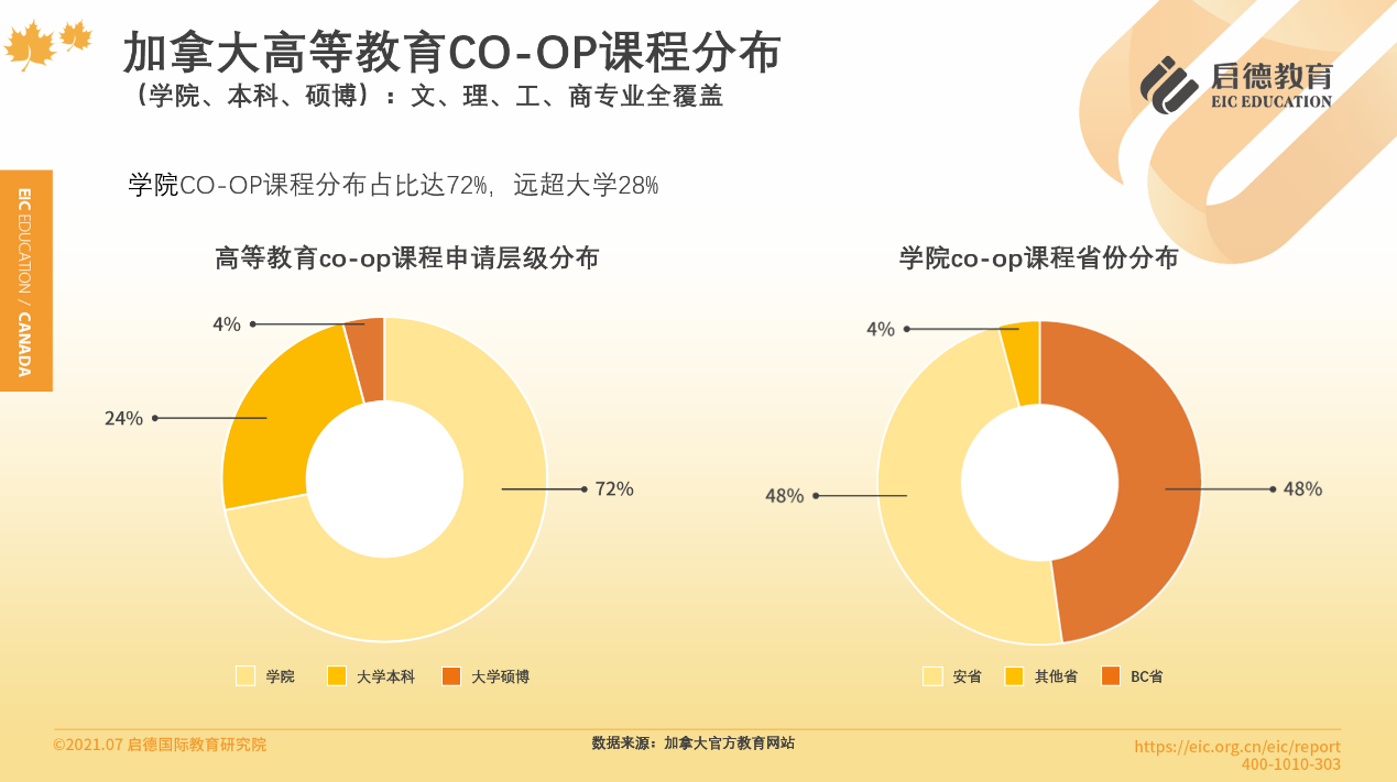 加拿大官方教育網(wǎng)站數(shù)據(jù)顯示,加拿大高等教育普遍開設(shè)覆蓋文、工、理、商全專業(yè)的 Co-op帶薪實(shí)習(xí)課程,其中學(xué)院的 Co-op課程占比最多(72% ),其次是大學(xué)本科(24% )與大學(xué)碩博(4% )。在學(xué)院 Co-op課程的省份分布上,安大略省與英屬哥倫比亞省平分秋色,各占48%。