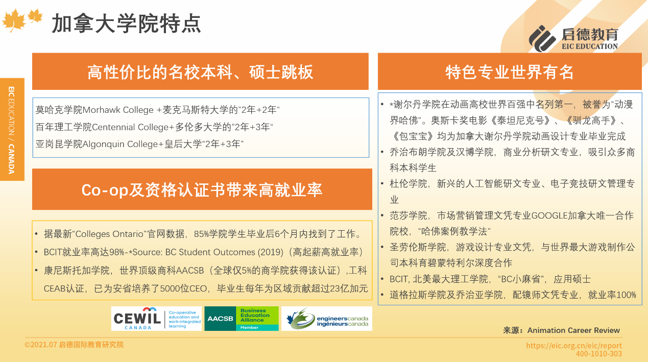 “ Colleges Ontario”官網(wǎng)數(shù)據(jù)顯示,85 %的學(xué)院學(xué)生畢業(yè)后6個(gè)月內(nèi)找到了工作,91%的雇主對(duì)學(xué)生表示非常滿意。如康尼斯托加學(xué)院,擁有世界頂級(jí)商科 AACSB與工科 CEAB認(rèn)證,為安省培養(yǎng)了5000位 CEO,畢業(yè)生每年為區(qū)域貢獻(xiàn)超過23億加元。而奧斯卡獎(jiǎng)電影《泰坦尼克號(hào)》、《馴龍高手》、《包寶寶》均為加拿大謝爾丹學(xué)院動(dòng)畫設(shè)計(jì)專業(yè)畢業(yè)完成。杜倫學(xué)院的人工智能專業(yè),道格拉斯學(xué)院的配鏡師專業(yè)也是世界有名的特色專業(yè)。