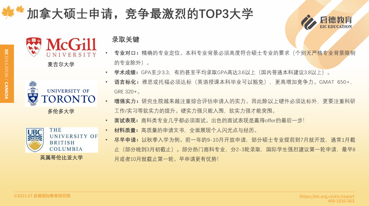 據(jù)啟德留學(xué)加拿大項(xiàng)目介紹,加拿大碩士申請(qǐng)競爭最激烈的三所大學(xué)為麥吉爾大學(xué)、多倫多大學(xué)與英屬哥倫比亞大學(xué)。申請(qǐng)人 GPA至少達(dá)到3.3,有的甚至要求平均錄取 GPA高達(dá)3.6以上(國內(nèi)普通本科建議3.8以上);雅思或托福必須達(dá)標(biāo)(英語授課本科專業(yè)可以豁免), GMAT650+, GRE320+;除硬件必須達(dá)標(biāo)外,加拿大名校注重科研、工作 /實(shí)習(xí)等軟實(shí)力的提升;商科類專業(yè)幾乎都必須面試。