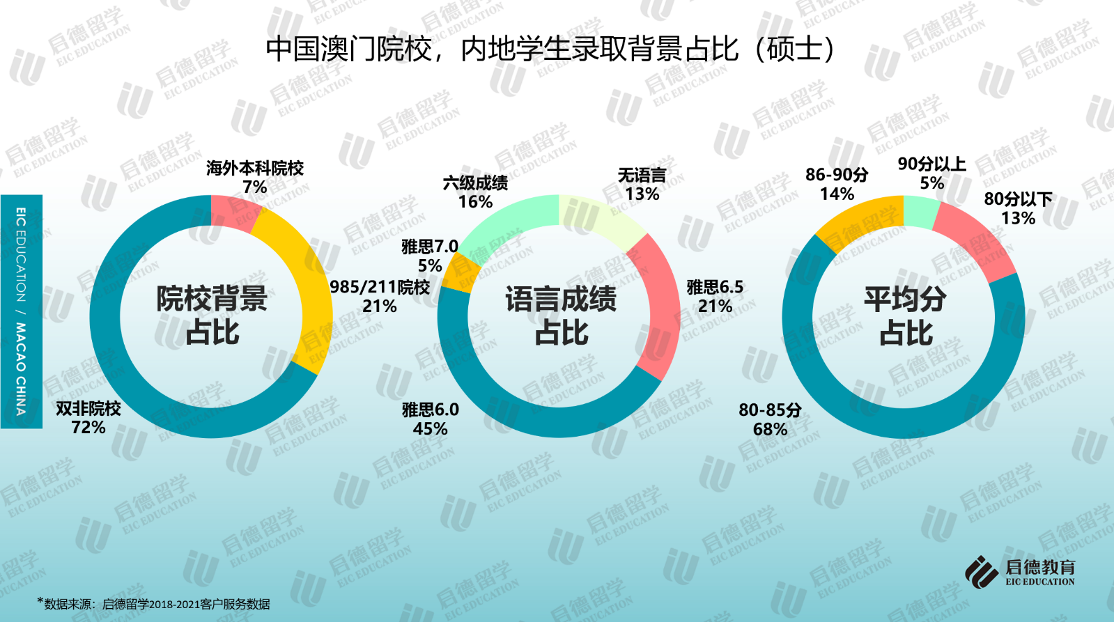 本科錄取中,澳門大學(xué)的要求較高,應(yīng)屆高考生申請人高考成績要達(dá)到一本線;碩士錄取中,只有澳門大學(xué)和澳門旅游學(xué)院要求碩士申請學(xué)生提交英語成績,雅思6分為澳門大學(xué)和澳門旅游學(xué)院的語言門檻要求,澳門大學(xué)碩士申請也可接受430分以上六級和TEM4/8成績;其它院校的大多數(shù)專業(yè)對英語成績無硬性要求。啟德留學(xué)2018-2021客戶服務(wù)數(shù)據(jù)顯示,2021年碩士錄取學(xué)生中,45%達(dá)到雅思6分的門檻成績,雅思成績6.5分以上達(dá)到26%,16%的學(xué)生只提供了合格的六級成績,13%為無語言錄?。黄叱梢陨系拇T士錄取學(xué)生來自雙非院校;GPA在80分以上的占比為87%。
