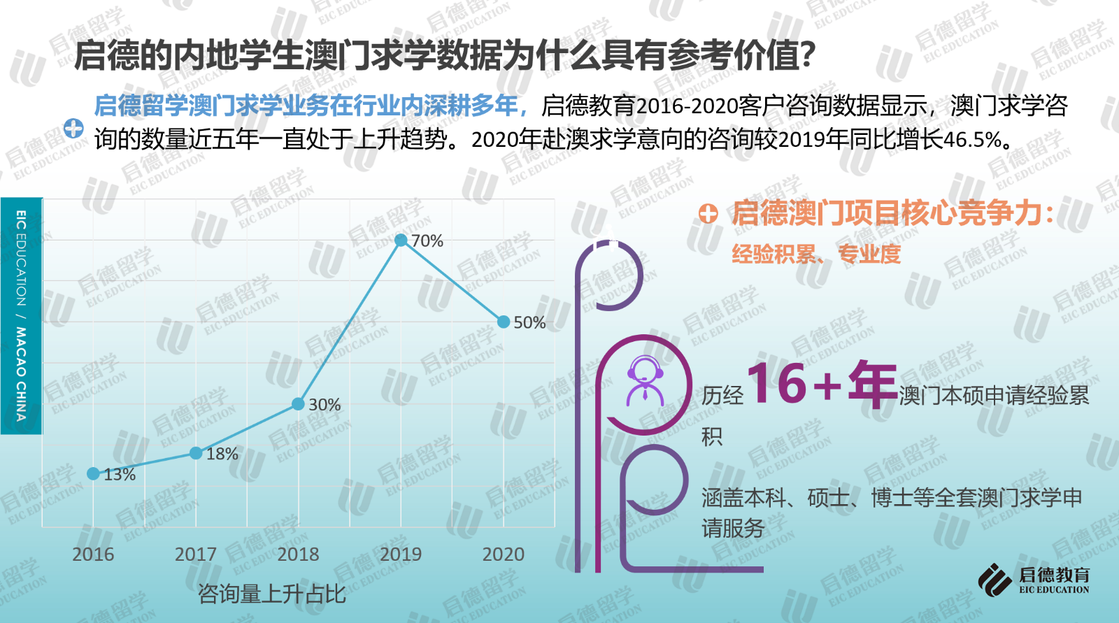 啟德留學(xué)2016-2020客戶服務(wù)數(shù)據(jù)顯示,澳門求學(xué)咨詢量近五年一直處于上升趨勢,2020年咨詢量較2019年同比增長46.5%。2021年10月31日,啟德留學(xué)在北京發(fā)布《2021中國澳門求學(xué)報告》,這也是行業(yè)內(nèi)首次針對中國內(nèi)地學(xué)生赴澳門求學(xué)情況進(jìn)行的梳理與分析,《報告》結(jié)合澳門高校官方數(shù)據(jù)及最近四年啟德學(xué)生澳門求學(xué)申請與錄取數(shù)據(jù),重點分析了澳門求學(xué)的申請要求與錄取趨勢、澳門六大高校的特色與優(yōu)勢專業(yè)、澳門本地就業(yè)情況,并就赴澳門求學(xué)規(guī)劃、申請準(zhǔn)備及求職就業(yè)等方面提供了建議。