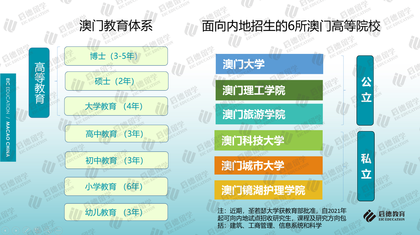 作為中西文化交匯的國際旅游城市,中國澳門的輕工業(yè)、旅游業(yè)、酒店業(yè)和娛樂場使其成為中外游客青睞的旅游度假勝地。澳門與香港同樣都具有獨特的地緣優(yōu)勢,既有中國文化的根基,又融會貫通了歐美教育的優(yōu)勢,中文、葡文、英文學(xué)制并存的多語言教學(xué)與多元文化交融的國際化環(huán)境,為學(xué)生提供了開闊的國際視野和學(xué)術(shù)氛圍,也為當(dāng)?shù)馗叩冉逃陌l(fā)展創(chuàng)造了良好的條件。目前,澳門大學(xué)、澳門理工學(xué)院、澳門旅游學(xué)院、澳門城市大學(xué)、澳門鏡湖護(hù)理學(xué)院、澳門科技大學(xué)等6所高校獲教育部批準(zhǔn)可面向內(nèi)地招收本科生及研究生,圣若瑟大學(xué)獲教育部批準(zhǔn)自2021年起可面向內(nèi)地試點招收研究生。