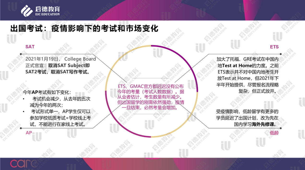 與此同時(shí),國(guó)產(chǎn)疫苗被海外多國(guó)認(rèn)可。此外,各種跡象表明,作為最主要的留學(xué)語(yǔ)言,2021年英語(yǔ)考試認(rèn)證已放寬,考點(diǎn)也在增多。除了日本37所知名院校開(kāi)展全英文授課外,韓國(guó)也可用英語(yǔ)成績(jī)遞交申請(qǐng),法國(guó)提供1700個(gè)左右的英文授課課程,荷蘭碩士英語(yǔ)授課覆蓋率為95%,英語(yǔ)普及率在全世界非英語(yǔ)母語(yǔ)國(guó)家中最高。2021年1月19日,College Board正式宣布取消SAT Subject即SAT2考試,取消SAT寫(xiě)作考試。2021年下半年 ETS對(duì)中國(guó)內(nèi)地考生開(kāi)放Test at Home。同年,BC也在加快在中國(guó)內(nèi)地的雅思機(jī)考考點(diǎn)建設(shè)速度,計(jì)劃2022年將雅思機(jī)考考點(diǎn)覆蓋內(nèi)地四十多個(gè)城市。