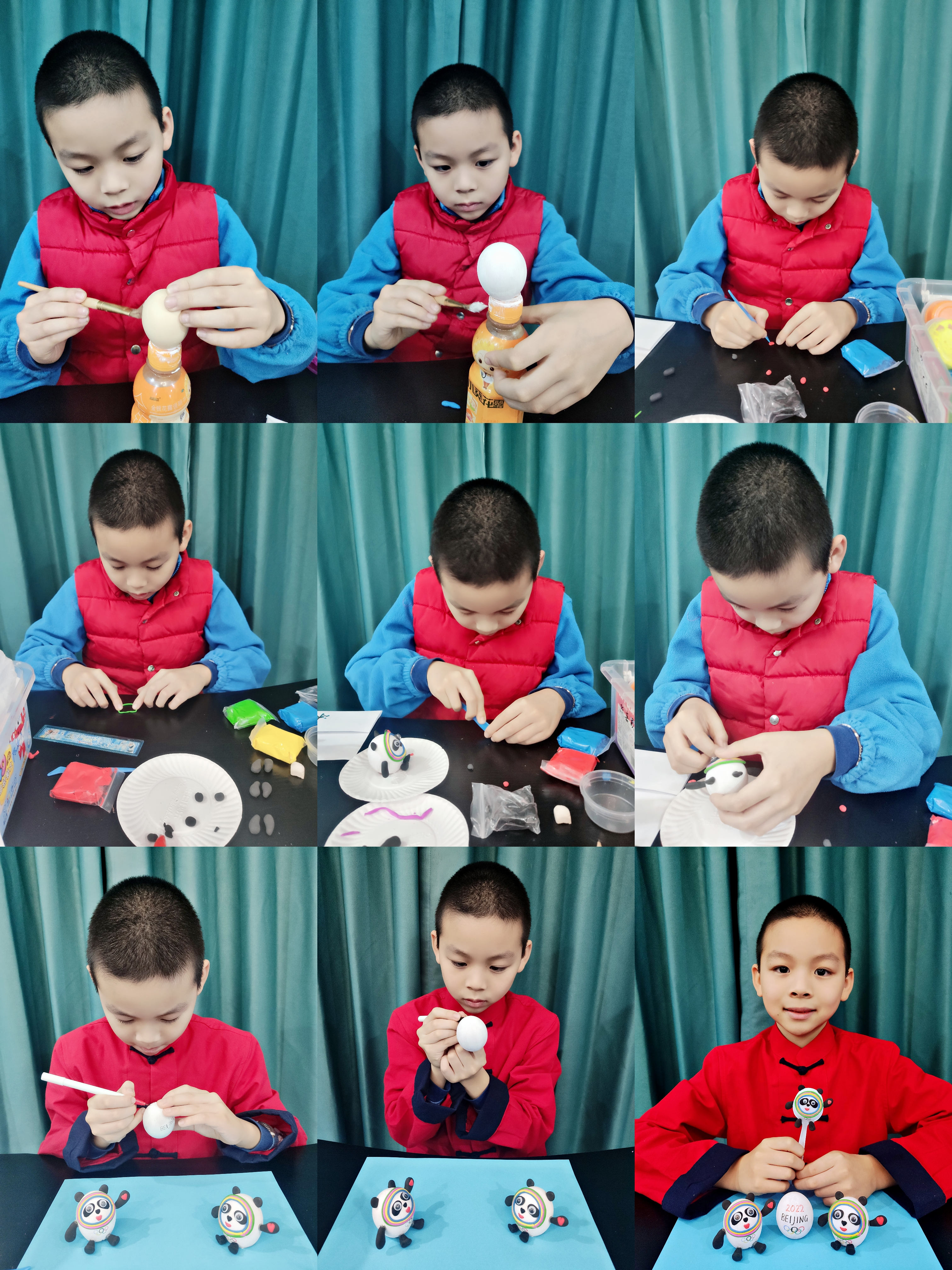 為了不讓蛋殼滾來滾去,我把蛋殼套到了瓶子上,第一步是給蛋殼刷上白色的顏料,晾干,再用輕黏土制作冰墩墩的五官和四肢。制作過程中,我遇到了難題——冰墩墩臉上的彩色光環(huán)可怎么做?我到到網(wǎng)上仔仔細細地觀察了冰墩墩的光環(huán),想到了解決辦法,最后我的蛋殼冰墩墩做好了。