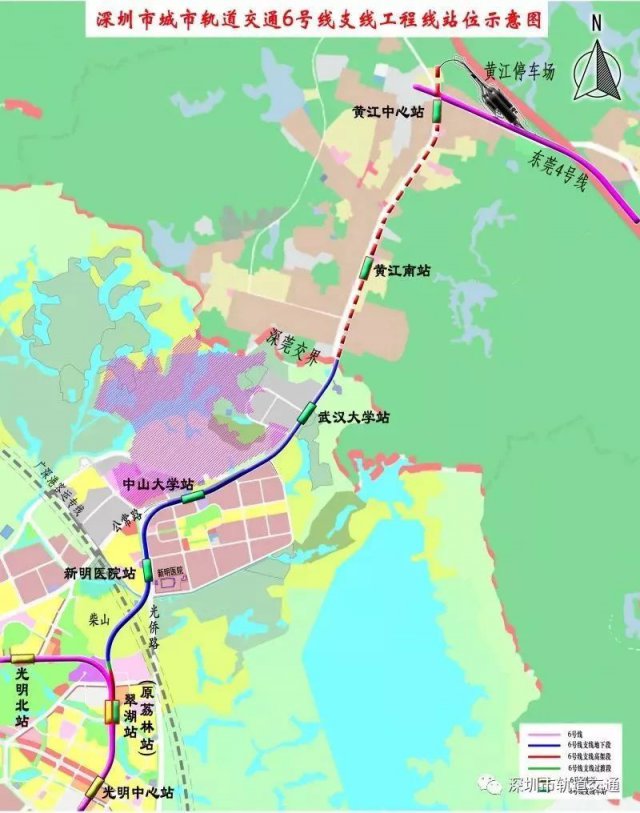 深圳地鐵6號線支線位于深圳市光明區(qū),起點設在6號線翠湖站東側(cè)(翠湖站為兩線換乘車站)、終點位于公常路深莞邊界,連接光明中心區(qū)和光明北區(qū)、中山大學,與規(guī)劃建設的東莞1號線南延線銜接,包括4站4區(qū)間:翠湖站(原荔林站)、新明醫(yī)院站、中山大學站、武漢大學站。
