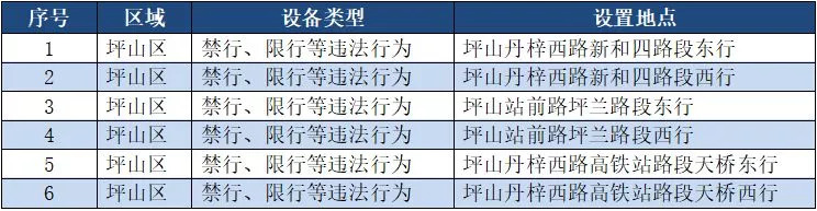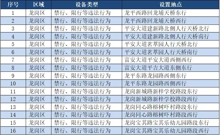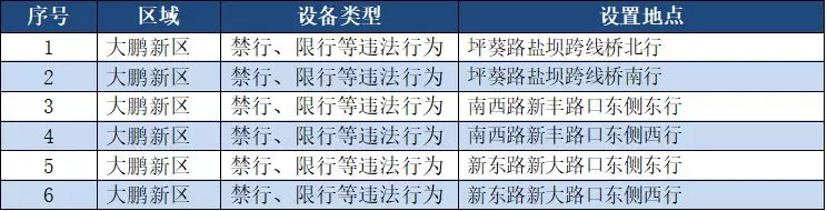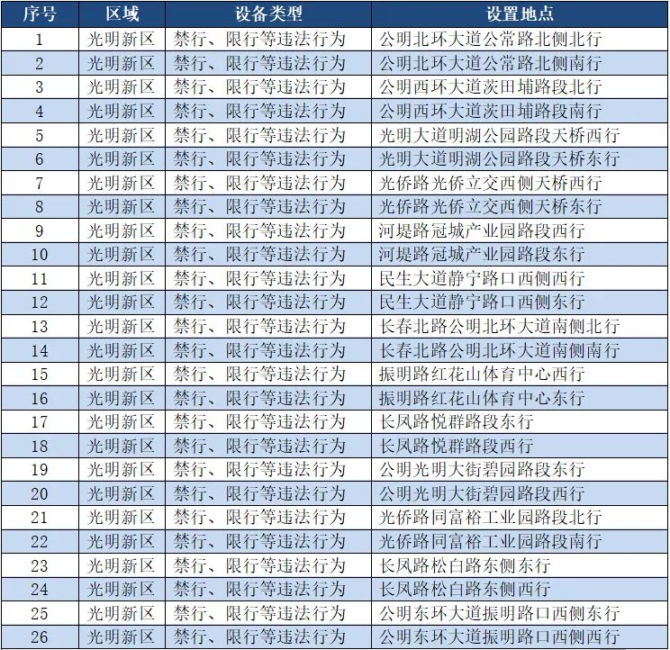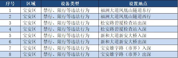另外,重點(diǎn)整治機(jī)動車禁行、限行等多種違法行為的交通技術(shù)監(jiān)控設(shè)備,深圳交警公布啟用87套。涉及福田區(qū)、羅湖區(qū)、南山區(qū)、寶安區(qū)、龍崗區(qū)、龍華區(qū)、光明新區(qū)、坪山區(qū)、大鵬新區(qū)等9個區(qū)域。