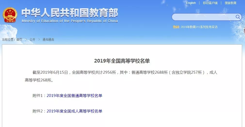 近日,教育部發(fā)布了《2019年全國高等學(xué)校名單》,截至2019年6月15日,全國高等學(xué)校共計2956所,其中普通高等學(xué)校2688所(含獨立學(xué)院257所),成人高等學(xué)校268所。
