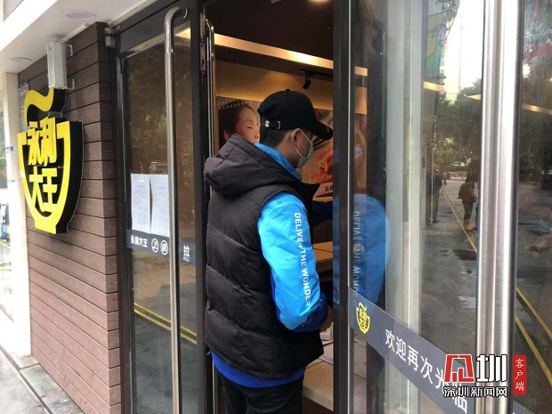 “店內(nèi)員工都是留深人員為主,每個班次都會測兩次體溫,要求員工佩戴口罩并手部消毒后才能上崗。現(xiàn)場消毒清潔時具備有專門的消毒粉,會每4小時進行一次清潔消毒?!庇篮痛笸豕ぷ魅藛T向記者介紹道?,F(xiàn)場門口處陸續(xù)有外賣小哥過來店前領(lǐng)取外賣,記者看到,外賣人員前來領(lǐng)取外賣前都要配合店家進行體溫測量,外賣餐盒都以獨立餐盒包裝的方式給到外賣小哥手上,以保證食物衛(wèi)生安全干凈。