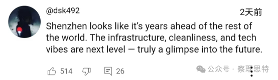 (“深圳看起來比世界其他地方領先好幾年?;A設施、清潔度和科技氛圍都是一個新的水平——真正讓人看到了未來。”)