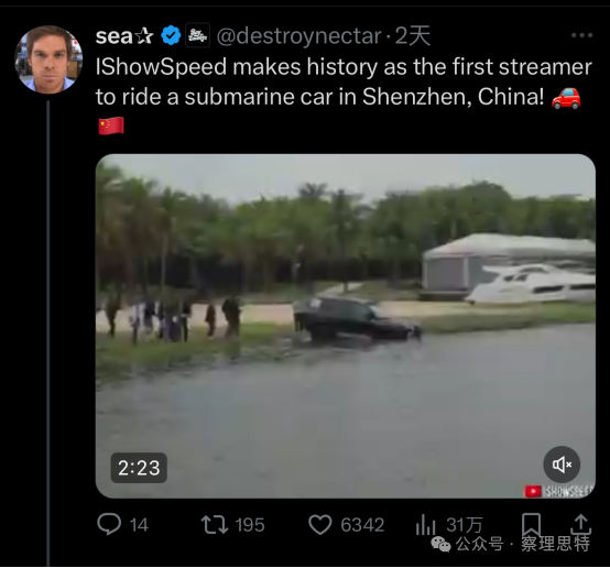 (IShowSpeed 創(chuàng)造了歷史,成為第一個在中國深圳乘坐潛水艇車的流量博主!)