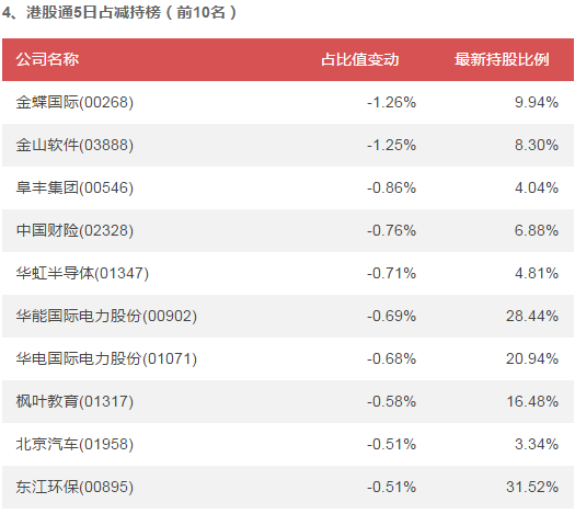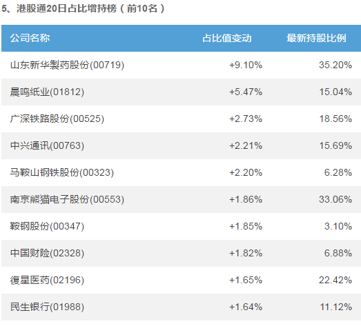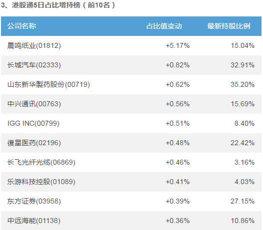 在最近5個交易日內,晨鳴紙業(yè)(01812)、長城汽車(02333)、山東新華製藥股份(00719)港股通持股占比增加值最大,分別增加5.17%、0.82%、0.62%;金蝶國際(00268)、金山軟件(03888)、阜豐集團(00546)港股通持股占比減少值最大,分別減少-1.26%、-1.25%、-0.86%。