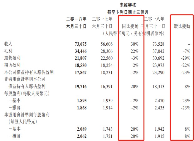其實(shí),如果單看上半年的業(yè)績(jī)報(bào)表,騰訊的業(yè)績(jī)還是可以的,收入、經(jīng)營(yíng)盈利、凈利潤(rùn)以及每股盈利都做到了雙位數(shù)增長(zhǎng),但要是對(duì)比2017年上半年的增長(zhǎng)數(shù)據(jù),2018年的明顯就弱了很多。2017年上半年收入和凈利潤(rùn)分別增長(zhǎng)57%和64%。主要原因是2018年第二季度的拖累,利潤(rùn)指標(biāo)環(huán)比出現(xiàn)了不同程度的下滑。