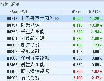 智通財(cái)經(jīng)APP獲悉,多只炒高的光伏股今日顯著回吐,截至11時(shí)53分,卡姆丹克太陽(yáng)能(00712)跌14.29%,報(bào)價(jià)0.09港元,陽(yáng)光能源(00757)跌13.39%,報(bào)0.11港元。