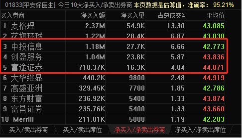 整體而言,中投信息、創(chuàng)盈服務(wù)、富途證券三大聯(lián)席券商合計(jì)凈買(mǎi)入平安好醫(yī)生約300萬(wàn)港元,占其全天成交額的17%,內(nèi)地資金一下已經(jīng)成為該股的主要參與者。