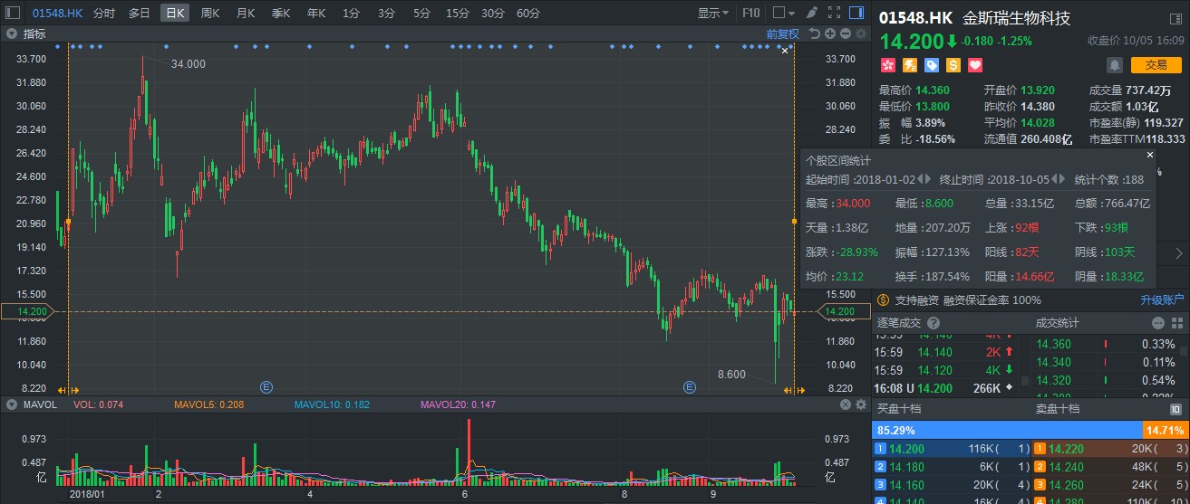談及去年的港股牛市,金斯瑞應(yīng)該算得上是生物醫(yī)藥板塊中,非常引人注目的一只股票。就算2018年隨大市回調(diào),但表現(xiàn)仍可圈可點(diǎn):受益港股通北水資金利好,成交量異?;钴S,成交量平均每日達(dá)到2000萬(wàn)股,總額平均4.08億港元。細(xì)數(shù)港股通標(biāo)的,有如此活躍成交量的股票確實(shí)不多。