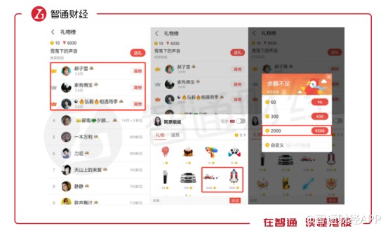 在用戶進(jìn)入K歌界面后,除了K歌按鍵還有就是歌曲榜單,這些榜單記錄的是該歌曲翻唱獲得禮物數(shù)的排行情況。翻唱歌手被打賞的禮物越多,榜單排名越高,禮物則是靠用戶通過現(xiàn)金兌換而來。與直播打賞類似,全民K歌也是通過用戶購買虛擬禮物進(jìn)行變現(xiàn)。