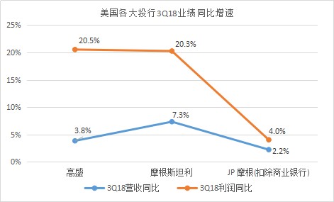 三家投行的3Q18營(yíng)收增速在所有上市公司中排名靠后,從營(yíng)收和利潤(rùn)的同比增速來看,JP摩根都是排名墊底,高盛和“大摩”的利潤(rùn)增速都超過20%,大大超過利潤(rùn)增速。