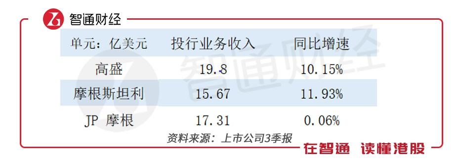 由于JP摩根有大部分營(yíng)業(yè)收入來自商業(yè)銀行的業(yè)務(wù),而高盛和摩根斯坦利則幾乎沒有。為了更有針對(duì)性地對(duì)比,智通財(cái)經(jīng)APP只統(tǒng)計(jì)JP摩根中的“公司和投資銀行”和“資產(chǎn)和財(cái)富管理”這兩個(gè)板塊業(yè)務(wù)的數(shù)據(jù)。