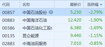 智通財(cái)經(jīng)APP獲悉,受國際油價(jià)下跌拖累,早盤石油股全線下滑,截至9時(shí)38分,中石油(00857)跌2.79%,報(bào)價(jià)5.23港元,中海油(00883)跌1.9%,報(bào)12.42港元,中石化(00386)跌1.69%,報(bào)6.38港元,昆侖能源(00135)跌1.15%,報(bào)9.44%港元。