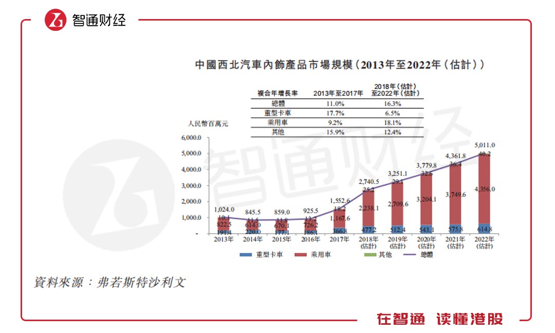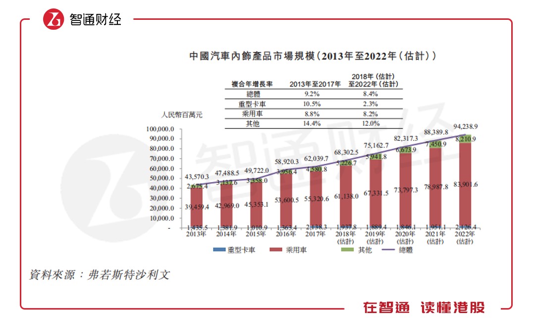 智通財(cái)經(jīng)APP進(jìn)一步查閱天瑞招股說明書發(fā)現(xiàn),從行業(yè)來看中國汽車內(nèi)飾產(chǎn)品市場(chǎng)的總值由2013年的435.7億元增至2017年的620.4億元,復(fù)合年增長率為9.2%。估計(jì)市場(chǎng)規(guī)模將于2022年達(dá)到942.39億元,2018年至2022年期間的復(fù)合年增長率為8.4%。