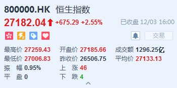 智通財(cái)經(jīng)APP獲悉,中美貿(mào)易摩擦憂慮減退,市場(chǎng)情緒得到提振,恒指早盤高開2.56%,報(bào)27185.66點(diǎn)。全日維持高位震蕩,截至收盤,恒生指數(shù)漲675.29點(diǎn)或2.55%,報(bào)27182.04點(diǎn),全日成交額達(dá)1296.25億。國(guó)企指數(shù)漲2.45%,報(bào)10882.16點(diǎn),紅籌指數(shù)漲1.21%,報(bào)4391.2點(diǎn)。