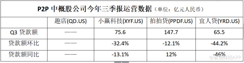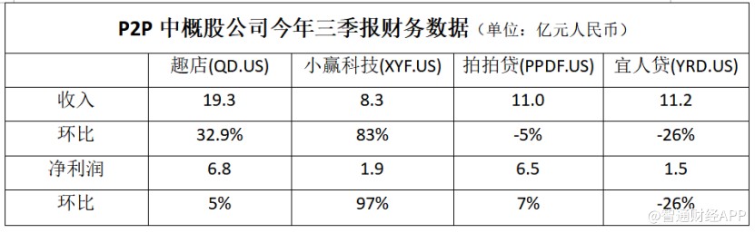 智通財經(jīng)APP觀察到,在披露三季報的P2P中概股公司中,趣店(QD.US)收入達19.3億元(人民幣,單位下同),環(huán)比增長32.9%,同期凈利潤為6.8億元,環(huán)比增長5%;小贏科技(XYF.US)收入為8.3億元,環(huán)比增加83%,凈利潤為1.9億元,環(huán)比增長97%;拍拍貸(PPDF.US)收入為11億元,環(huán)比下跌5%,凈利潤為6.5億元,環(huán)比增長7%;宜人貸(YRD.US)收入為11.2億元,環(huán)比下跌26%,凈利潤為1.5億元,環(huán)比下跌26%。