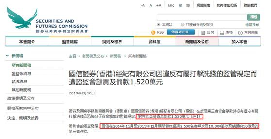 智通財(cái)經(jīng)APP獲悉,香港證監(jiān)會(huì)18日發(fā)布消息稱,國(guó)信證券(香港)經(jīng)紀(jì)有限公司因違反有關(guān)打擊洗錢的監(jiān)管規(guī)定,遭香港證監(jiān)會(huì)譴責(zé)及罰款1520萬(wàn)港元。