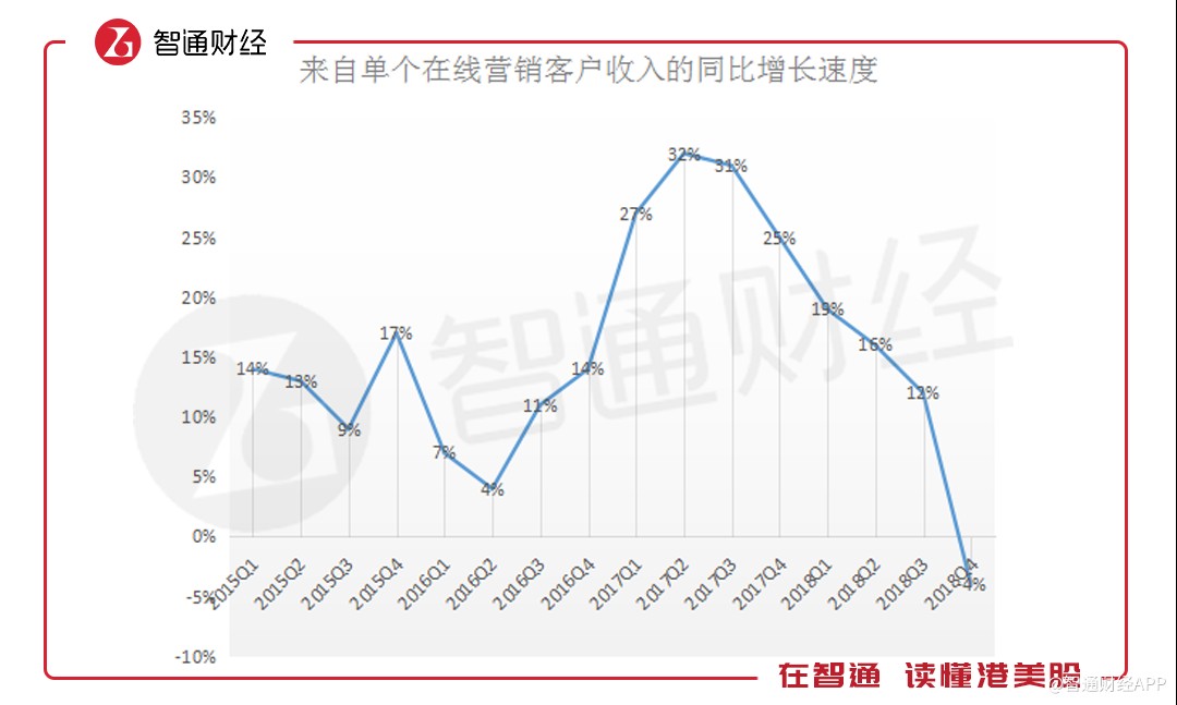 在連續(xù)下滑5個(gè)季度后,至2018年第四季度時(shí),單個(gè)在線營(yíng)銷(xiāo)客戶收入同比下滑4%,是2015年以來(lái)的首次負(fù)增長(zhǎng)。而四季度在線廣告收入同比增長(zhǎng)10%主要是因?yàn)樵诰€營(yíng)銷(xiāo)客戶數(shù)量的增加。財(cái)報(bào)中表示,第四季度時(shí),公司的在線營(yíng)銷(xiāo)客戶為52.9萬(wàn)名,同比增長(zhǎng)15%。