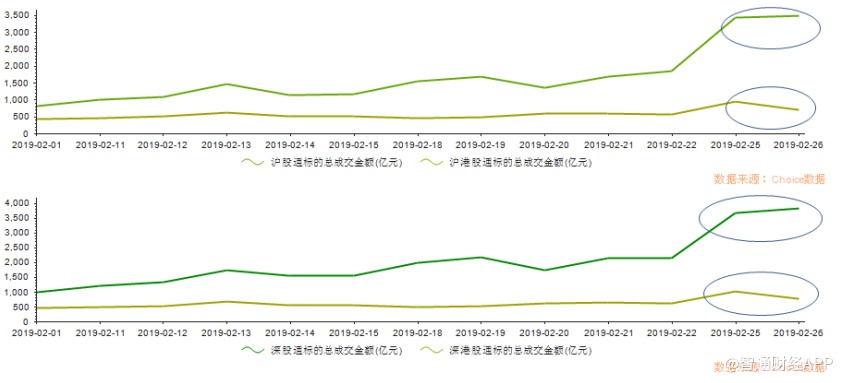隨著兩地逐漸趨于技術(shù)牛市的形態(tài),2月的滬(深)股通、滬(深)港股通標的總成交金額折線一路向上,近兩日驟然上揚。