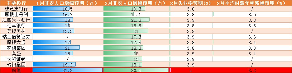 但是,根據(jù)智通財經(jīng)APP整理出的11家大型投行的非農(nóng)預測顯示,相對于1月非農(nóng)就業(yè)人口大增30.4萬而言,各投行對于美國2月非農(nóng)就業(yè)人口增幅的預期不太樂觀。整體來看,華爾街對美國2月季調(diào)后非農(nóng)就業(yè)人口增幅預測介于14.1萬-21.5萬之間,失業(yè)率預測介于3.8%-3.9%之間,平均時薪年率增幅預測介于3.3%-3.5%之間。