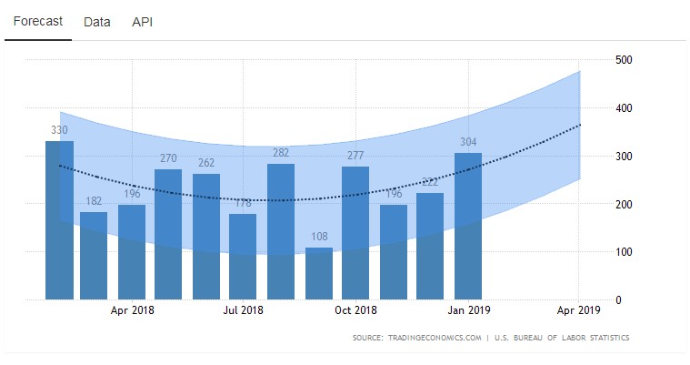 根據(jù)Trading Economics的預測,2月非農(nóng)數(shù)據(jù)將會延續(xù)1月的勢頭,呈現(xiàn)上行趨勢。