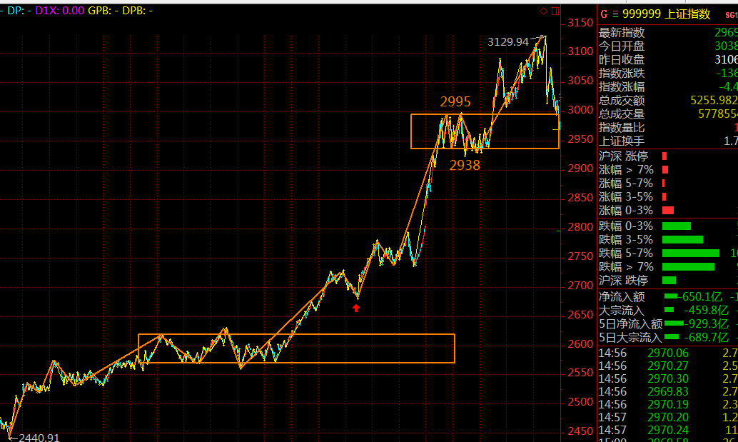 可以很明顯的看出,這是一波五分鐘級別的雙中樞上漲,這波上漲隨著周五尾盤跌入2995點結(jié)束。市場在后續(xù)的演化過程中會做出選擇:開始五分鐘級別下跌趨勢,或者圍繞著五分鐘上漲趨勢的最后一個中樞進行行情級別擴張。不論哪種情況,從纏論的視角,短期這輪上漲趨勢暫告一段落,3129.94點即是五分鐘趨勢的第一類賣點,在下周,市場企穩(wěn)后,大概率會上沖構(gòu)建第二類賣點。