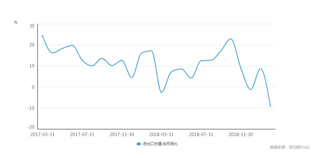 同時,進出口數(shù)據(jù)持續(xù)低迷。中國海關(guān)總署3月8日公布數(shù)據(jù)顯示,2019年2月,我國進出口總值2663.6億美元,同比增長-13.8%。其中出口1352.4億美元,同比增長--20.7%;進口1311.2億美元,同比增長-5.2%。