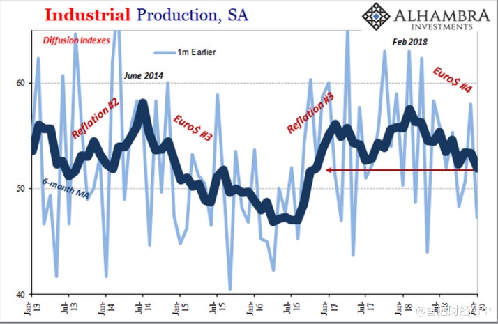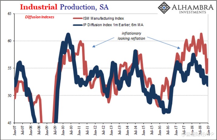 美聯(lián)儲(chǔ)計(jì)算了一個(gè)擴(kuò)散指數(shù)(滯后一個(gè)月,即更新后的擴(kuò)散指數(shù)為2019年1月)作為其工業(yè)生產(chǎn)數(shù)據(jù)的一部分。月度數(shù)據(jù)表現(xiàn)不穩(wěn)定,但平均而言在時(shí)間和解讀上是明確無(wú)誤的。即使是ISM制造業(yè)的PMI的走勢(shì)也幾乎跟隨美聯(lián)儲(chǔ)擴(kuò)散指數(shù)。