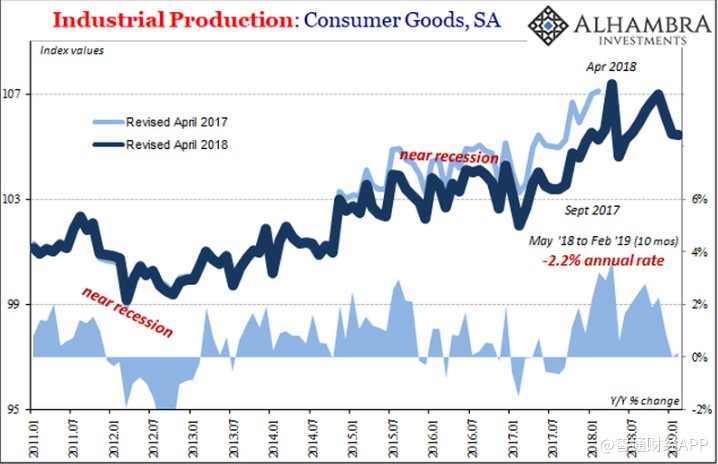 美國(guó)制造業(yè),特別是消費(fèi)品行業(yè),與歐洲(以及中國(guó))行業(yè)發(fā)展形勢(shì)趨同。追溯到去年五月,美國(guó)商品行業(yè)幾乎沒(méi)有增長(zhǎng)。就消費(fèi)品而言(更接近經(jīng)濟(jì)放緩的權(quán)重),它與歐洲出現(xiàn)的完全萎縮狀況非常相似。