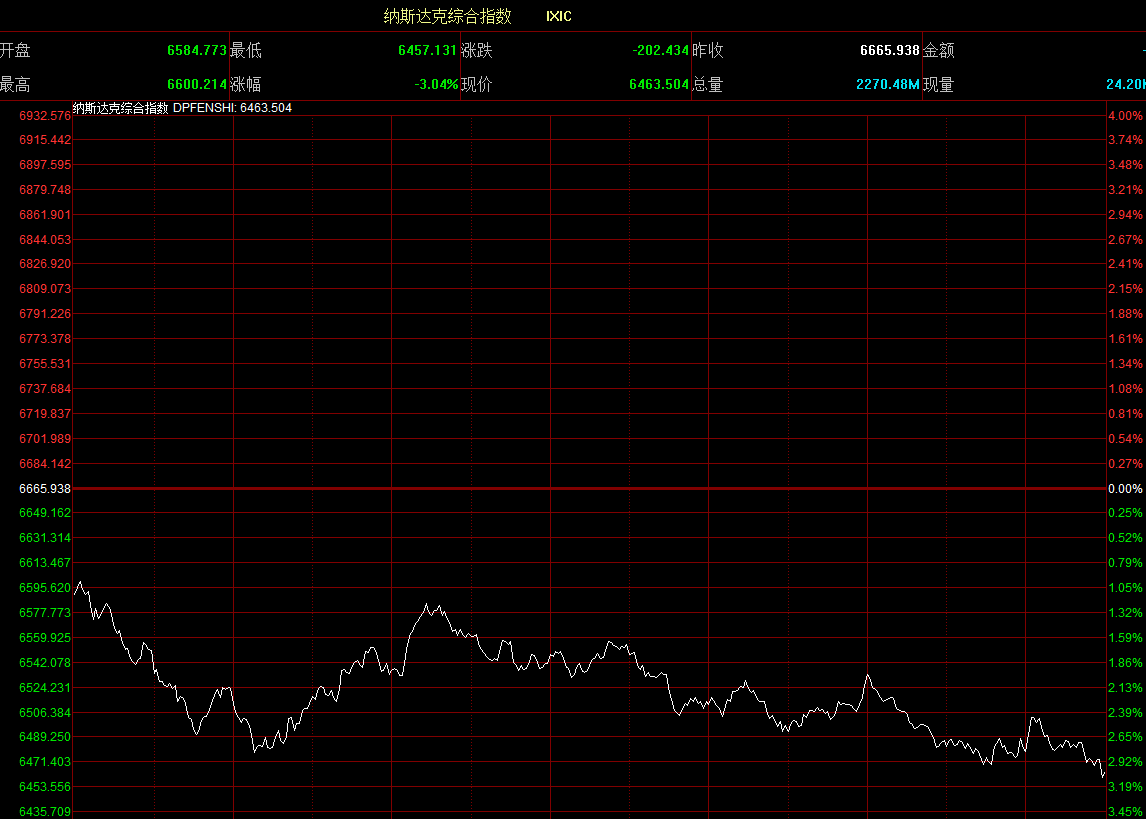 美股周一收市大幅受挫,創(chuàng)史上最差圣誕節(jié)前夜表現(xiàn)。道指以全日最低位收市,報(bào)21792點(diǎn),跌653點(diǎn)或2.91%;標(biāo)指收?qǐng)?bào)2351點(diǎn),跌65點(diǎn)或2.71%,自高位回落約兩成,技術(shù)上陷入熊市;納指收?qǐng)?bào)6192點(diǎn),跌140點(diǎn)或2.21%。