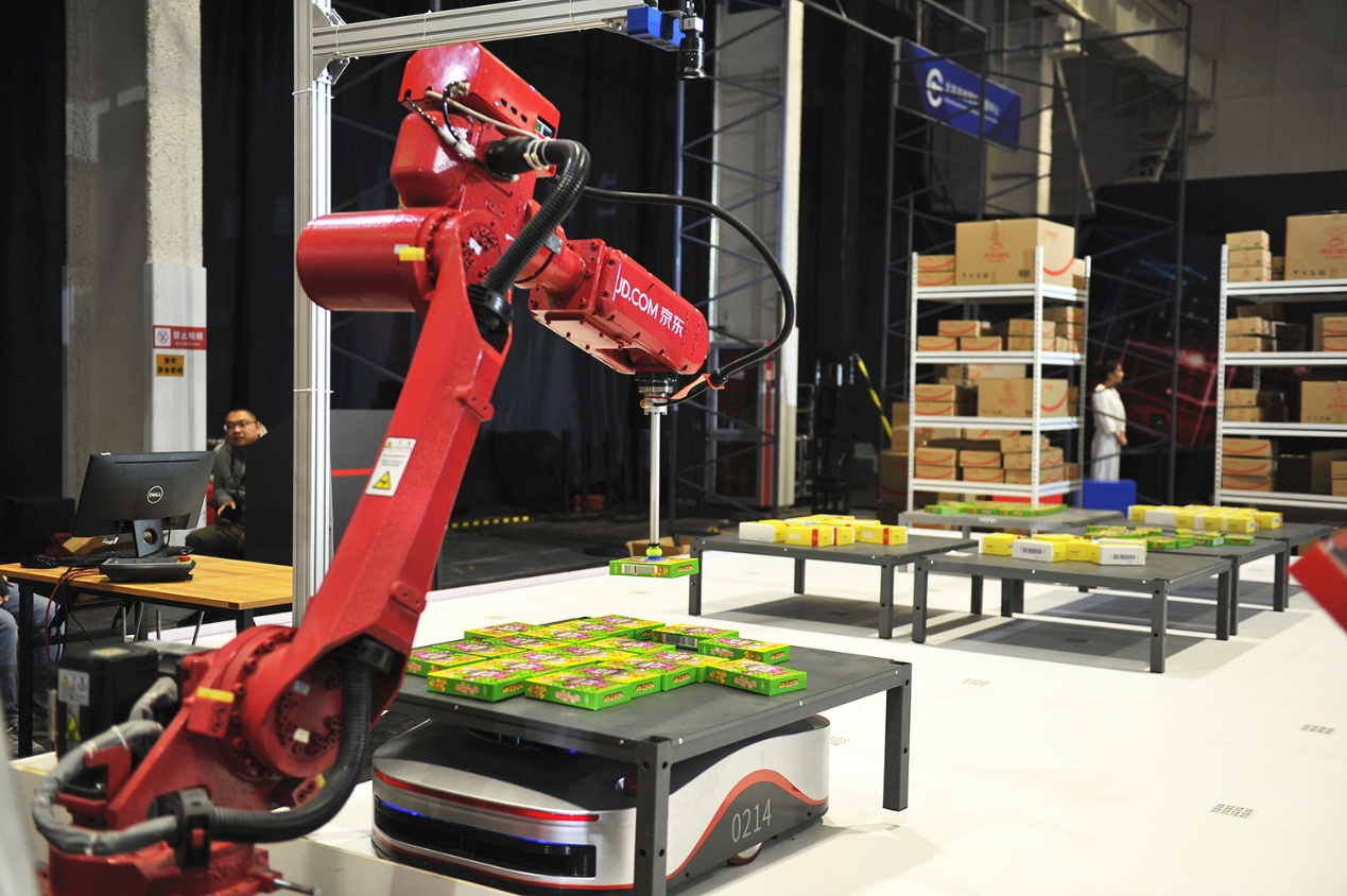 為了展現(xiàn)無人倉的全程智能化流程,本次峰會外展區(qū)設置了智能動態(tài)展區(qū)。在現(xiàn)場,動態(tài)運行的揀選機械臂、自動打包機與飛馬機器人、智能叉車等一起,共同構成了京東無人倉強大的倉儲系統(tǒng)。目前在京東智能化倉儲體系內,智能機器人設備已經(jīng)實現(xiàn)了家用電器、美妝個護、電腦辦公、服飾內衣、醫(yī)療保健等五大訂單品類的應用場景覆蓋,通過地狼、天狼、分揀AGV、交叉帶分揀機、AGV叉車、機械臂等12種自主研發(fā)機器人的投用,大大提升了京東的訂單處理效率。