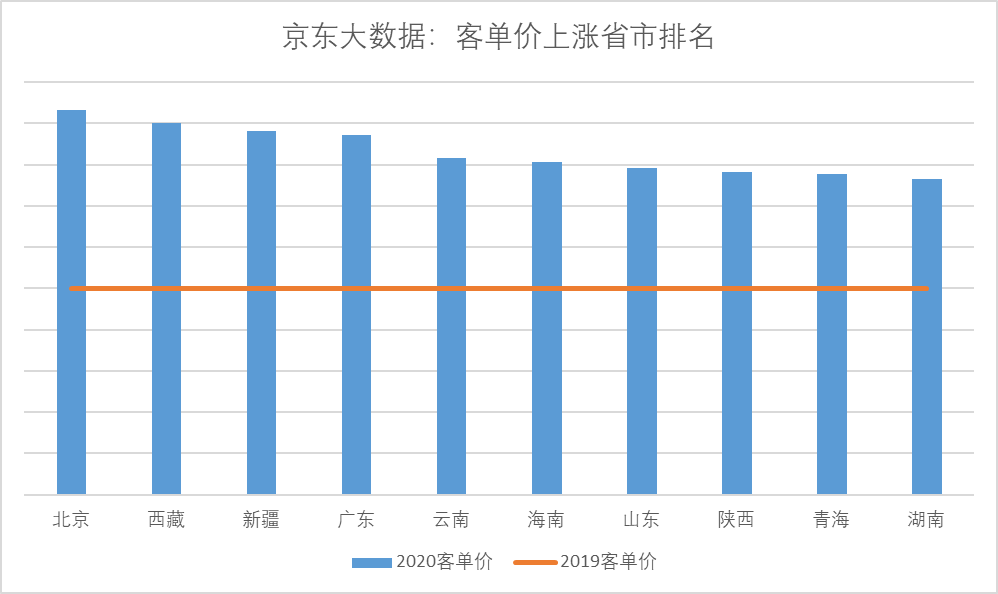 但是,消費(fèi)者采購(gòu)月餅時(shí)卻呈現(xiàn)出更積極的上升趨勢(shì):據(jù)京東大數(shù)據(jù),今年京東平臺(tái)上不但用戶數(shù)大幅增加,其中相當(dāng)大部分新用戶來(lái)自低線市場(chǎng)用戶,而且消費(fèi)者相比去年更加追求品質(zhì),大品牌、高規(guī)格的月餅禮盒熱銷,因此月餅平均客單價(jià)比去年上漲了35%以上。下圖可見,除北京廣東等發(fā)達(dá)地區(qū)外,客單價(jià)上漲的主要?jiǎng)恿?lái)自于西北、西南和華中等地區(qū)。