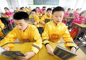 據(jù)悉,寶龍學(xué)校是寶安區(qū)第一所民辦學(xué)校,在校學(xué)生絕大多數(shù)為勞務(wù)工子女。孩子們的父母常常因忙于工作,而忽略了對他們的傳統(tǒng)道德教育。“剛學(xué)文化知識時不懂得基本禮儀是多數(shù)孩子的通病,很多孩子初入社會很難適應(yīng)?!痹撔6麻L陳寶元表示,學(xué)校從上學(xué)期開始就從校外引進國學(xué)老師,每天教授孩子們誦讀國學(xué)經(jīng)典。圖為寶龍學(xué)校的師生在課前齊誦國學(xué)經(jīng)典。